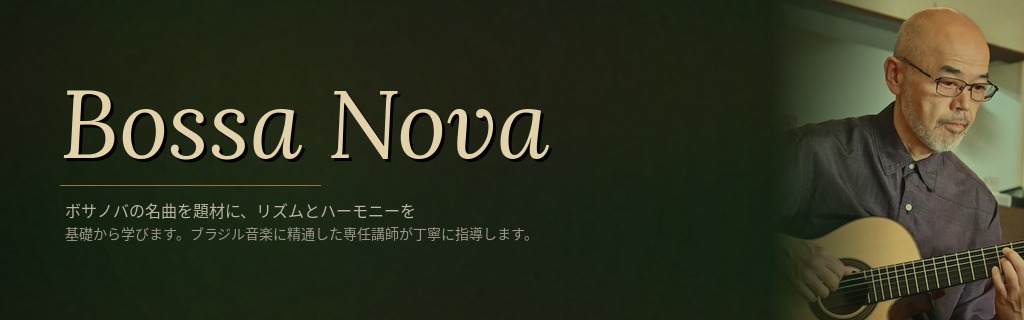 ボサノバの名曲を題材に、ボサノバギター特有のリズムパターン、 テンションコードの押さえ方、右手のタッチなどを基礎から学びます。 ブラジル音楽に精通した専任講師が、初心者の方からソロギターに挑戦したい経験者の方まで 丁寧に指導します
