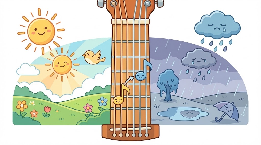 • 4弦2フレット(ミ)を押さえると → Cメジャー(明るい)