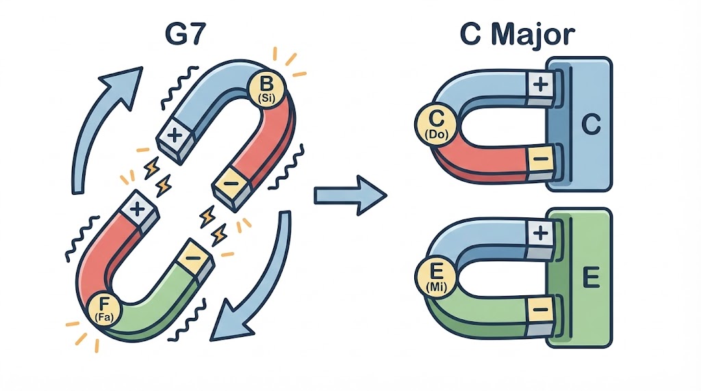 なぜ「G7」を弾くと、無性に「C」を弾きたくなるのか? その正体は、音の中に仕込まれた強力な磁石にありました。