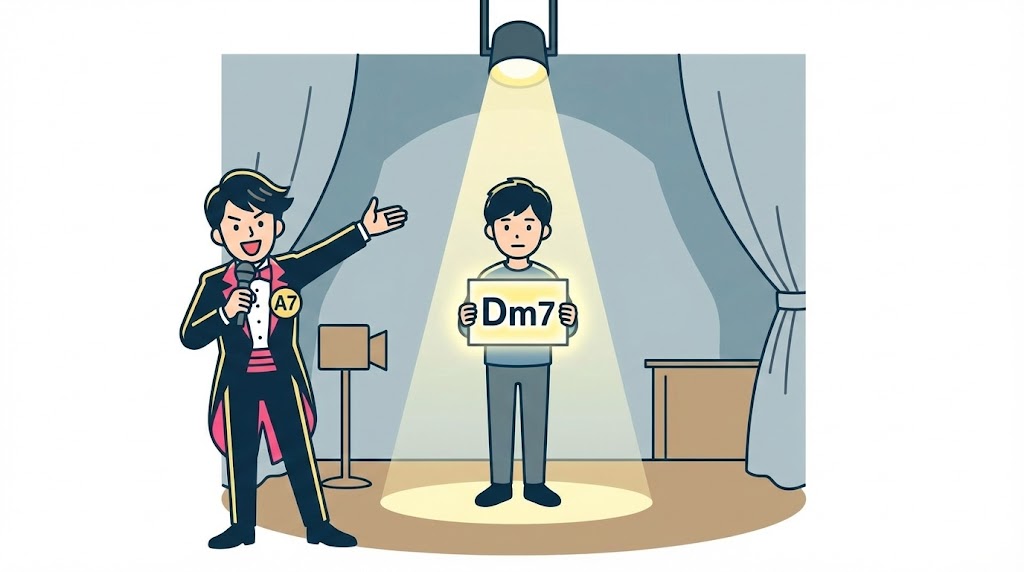 すると、響きがこう変わります。 「家を出ました。…さあ皆さんご注目! 次に登場するのは、あの『Dm7』さんです! どうぞー!(ファンファーレ)」
