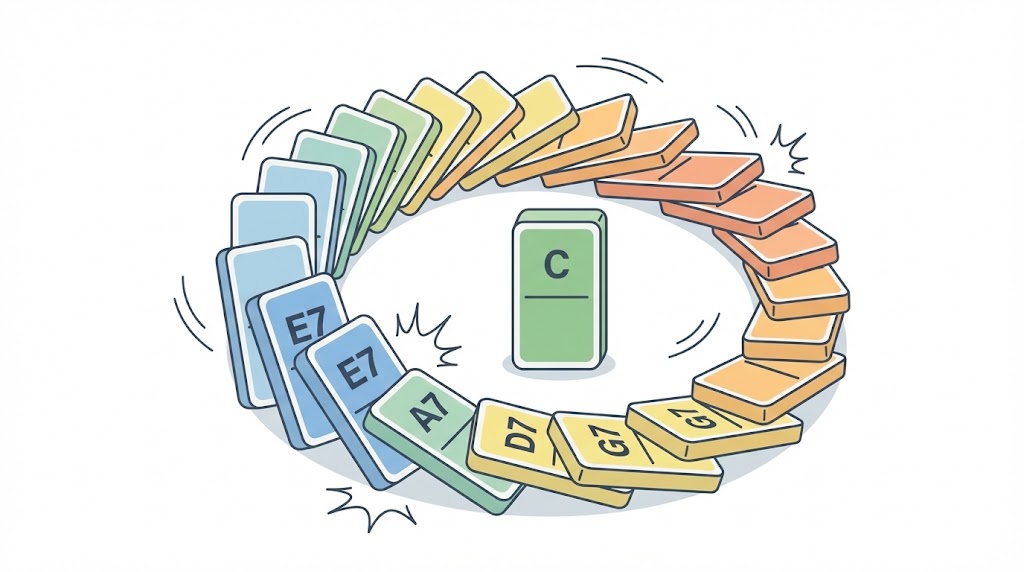 - 循環(サークル): E7 → A7 → D7 → G7 → C のように、5度下へ次々とジャンプしていく進行。