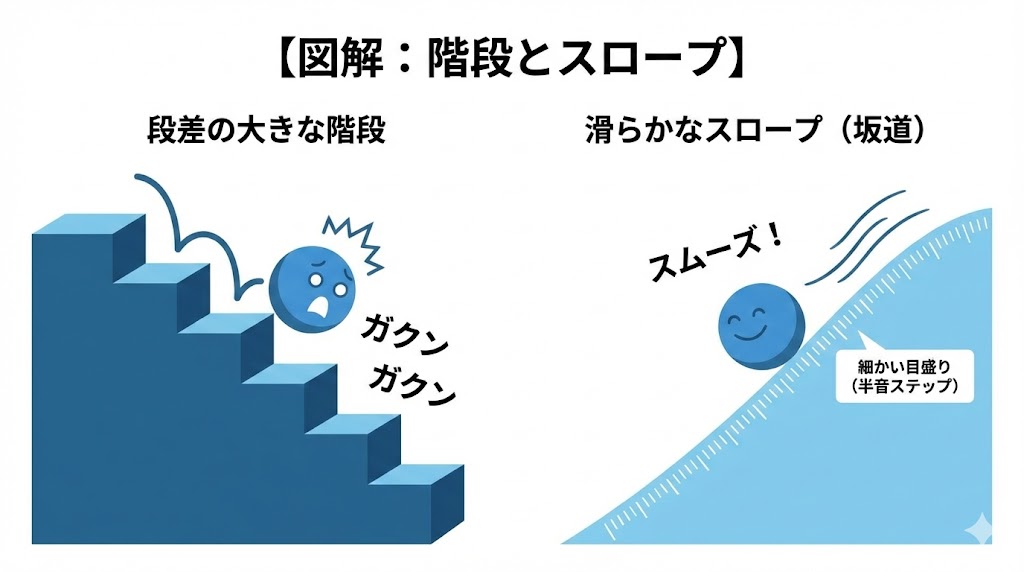 - 効果: 段差の激しい階段が、スロープのように滑らかな坂道になり、流れるようなフレーズが弾ける。