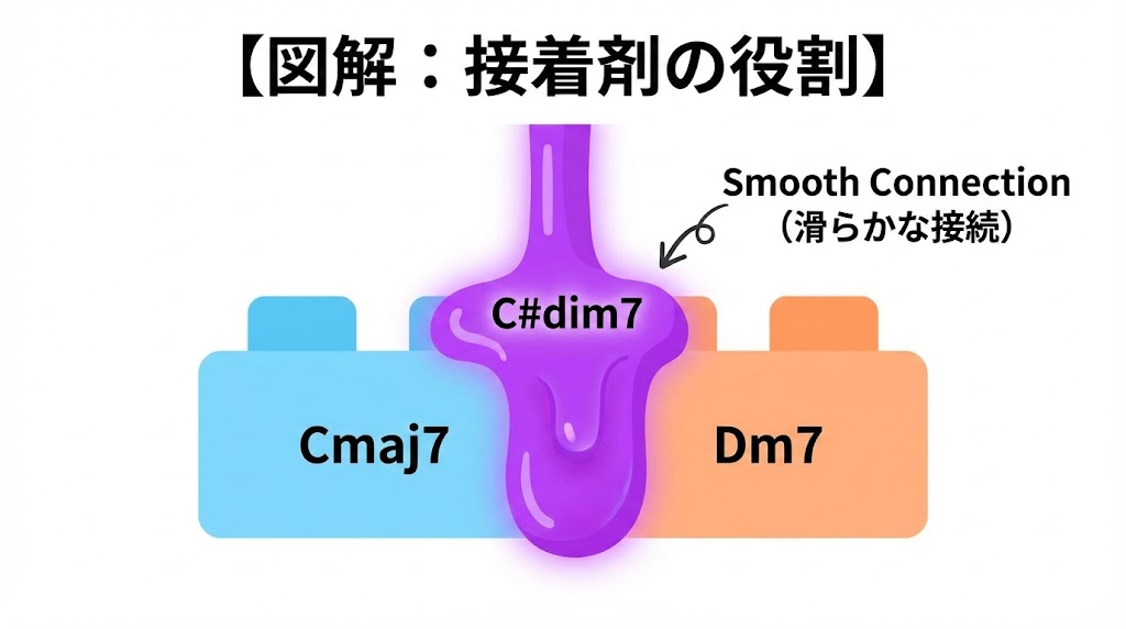 すると、ベース音が「ド → ド# → レ」と半音でピッタリ繋がります。 あんなに不気味だったディミニッシュが、ここでは**「強力な接着剤」**として機能し、離れた2つのコードを滑らかに結びつけてくれるのです。