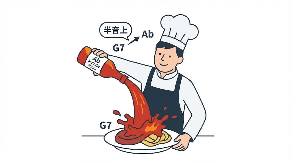 例えば、「G7」でオルタードな響きを出したい時。 G(ソ)の半音上は…「Ab(ラb)」ですね。 迷わず、**「Abメロディックマイナー」**を弾いてください。