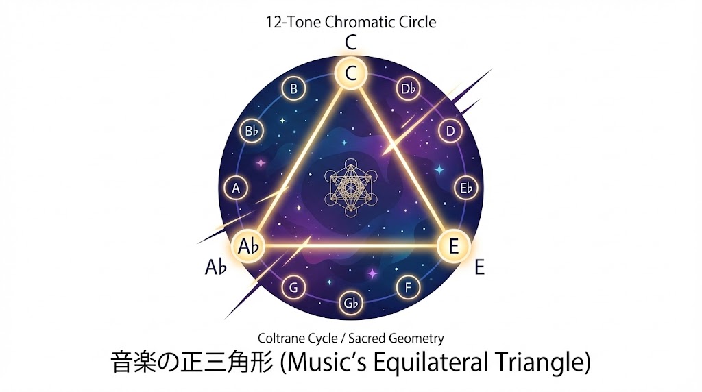従来のジャズは「五度圏(ド→ソ→レ…)」という**「円」の動きが基本でした。 しかしコルトレーンは、オクターブ(12個の音)を、「長3度(4半音)」という間隔で、機械的に・人工的にバッサリと3等分**したのです。